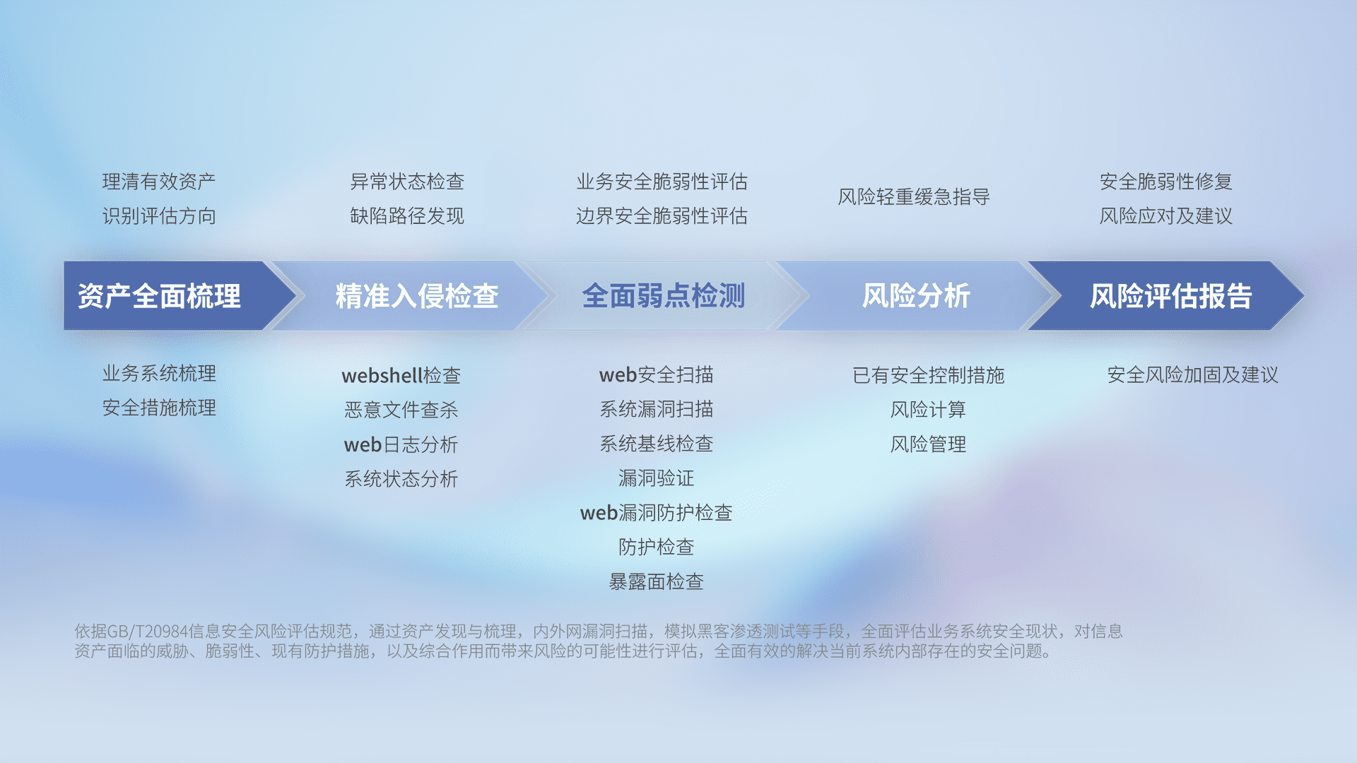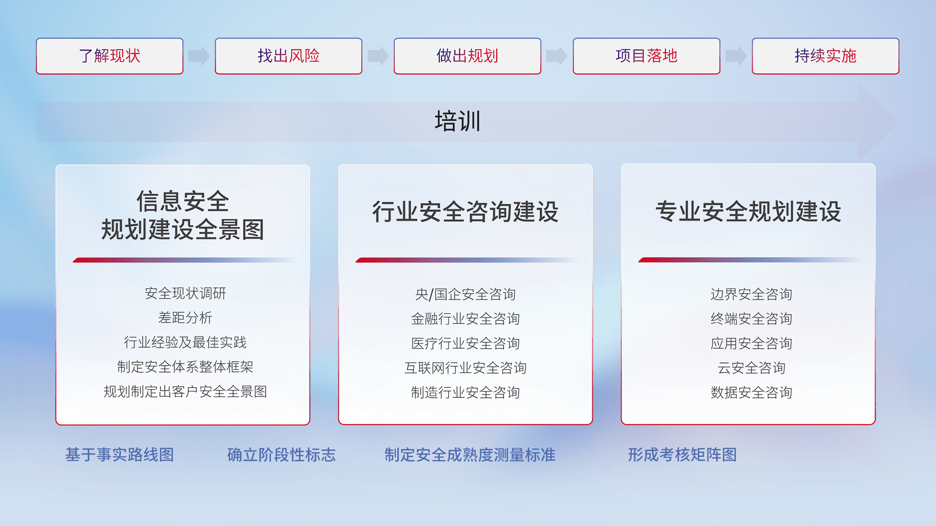 针对客户行业特性,,,,以专业的安全服务+多厂商联合解决方案提供专属的一站式安全管理服务,,帮助客户全面感知网络空间威胁,,,,基于识别、、、、检测、、、、分析、、、、防护、、、监测、、、响应的服务理论模型,,从方案咨询、、、、集成交付、、、、评估验证、、优化加固、、、运维运营,,致力于为客户提供完整的闭环管理式安全服务。。以实战经验为客户打造高抵御风险的安全体系,,帮助客户发现威胁、、、、对抗威胁、、处置威胁,,,,不断积累安全对抗能力,,,持续保障数字化安全。。。。